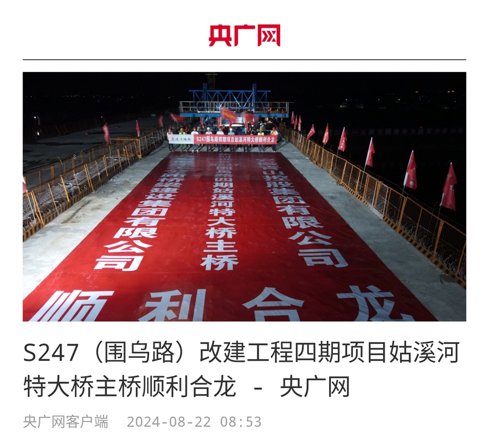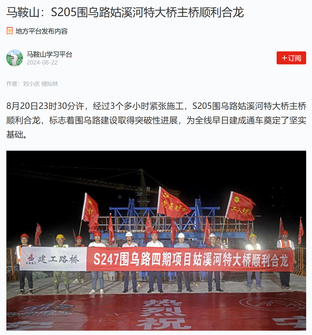8月20日晚上,随着最后一方混凝土浇筑完成,����� �������Ƴ������������ �������Ƴ������������ �������Ƴ������������ �������Ƴ�������安徽建工路桥承建的S247(围乌路)改建工程����� �������Ƴ����������� �������Ƴ����������� �������Ƴ������������ �������Ƴ�������四期项目关键控制性工程——姑溪河特大桥顺利实现����� �������Ƴ������������ �������Ƴ����������� �������Ƴ������������ �������Ƴ�������主桥跨中合龙,标志着项目建设取得重����� �������Ƴ������������ �������Ƴ������������ �������Ƴ������������ �������Ƴ�������大突破。