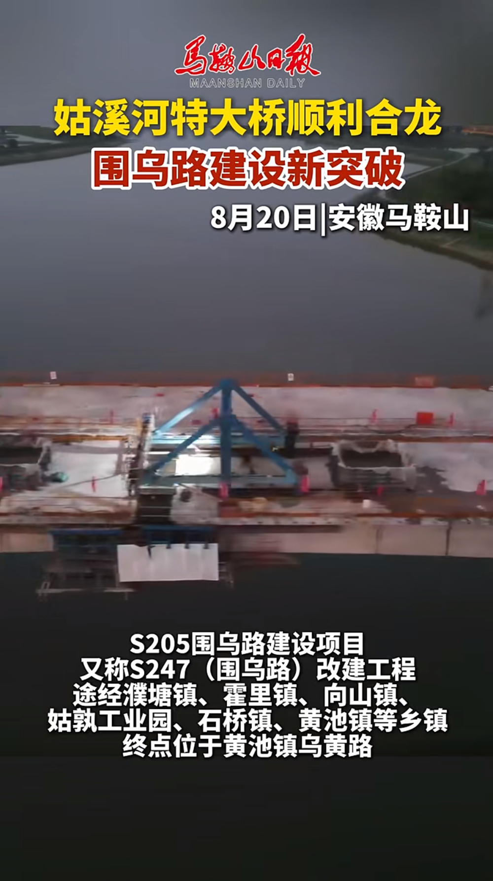 姑溪河特大桥全长1179米,宽24.5����� �������Ƴ������������ �������Ƴ������������ �������Ƴ������������ �������Ƴ�������米,采用大跨度连续刚构悬臂浇筑,����� �������Ƴ������������ �������Ƴ������������ �������Ƴ������������ �������Ƴ�������包含桩基184根、墩柱120根、箱梁2����� �������Ƴ������������ �������Ƴ������������ �������Ƴ������������ �������Ƴ�������00片、T梁30片,为S247(����� �������Ƴ������������ �������Ƴ������������ �������Ƴ����������� �������Ƴ�������围乌路)改建工程全线跨度最大、单体长度最长����� �������Ƴ������������ �������Ƴ����������� �������Ƴ������������ �������Ƴ�������的桥梁。本次合龙的主桥全����� �������Ƴ������������ �������Ƴ������������ �������Ƴ������������ �������Ƴ�������长287米,跨越姑溪河交通繁忙的通航河道,且施����� �������Ƴ������������ �������Ƴ������������ �������Ƴ������������ �������Ƴ�������工期间受夏季汛期影响,技术精度要求高、����� �������Ƴ������������ �������Ƴ������������ �������Ƴ������������ �������Ƴ�������交通压力和安全管控风险大。